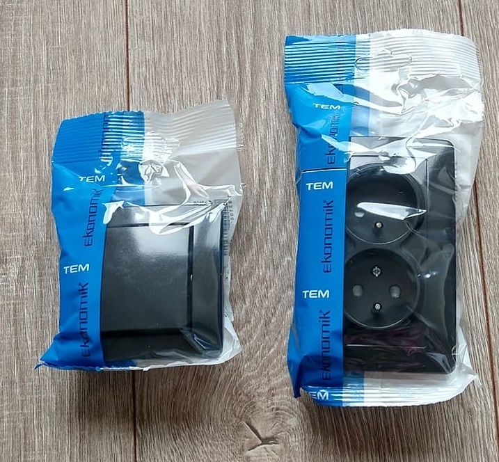 Predám dve čierne nové dvojzásuvky série TEM EKONOMIK, ktoré maú jednoduchý moderný dizajn. Drôty sa upevňujú do svoriek pomocou skrutkového spoja. Je to zásuvka s uzemňovacím kolíkom. A k nim čierny vypínač.