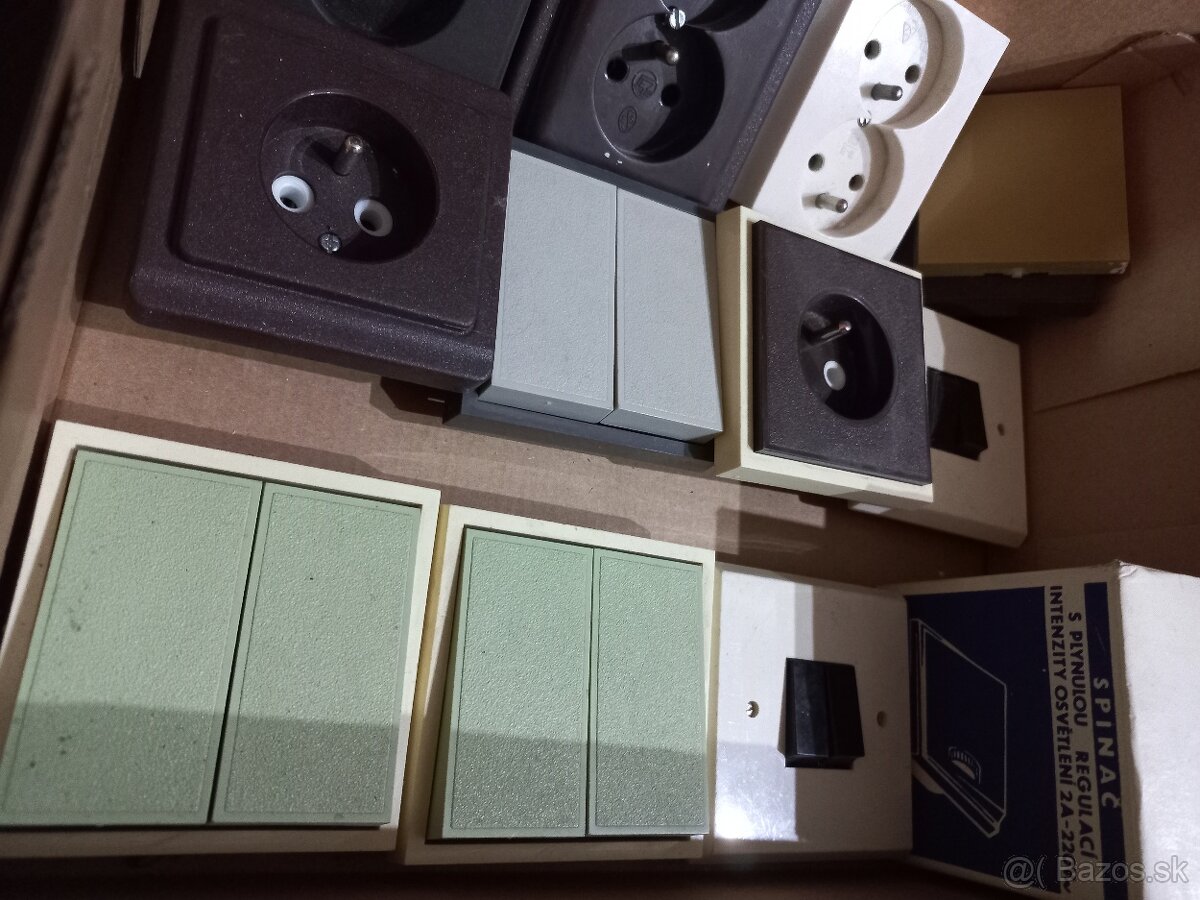 Predám "krabicu od topánok" plnú plastových zásuviek (5 ks) a plastových retro spínačov (6ks).