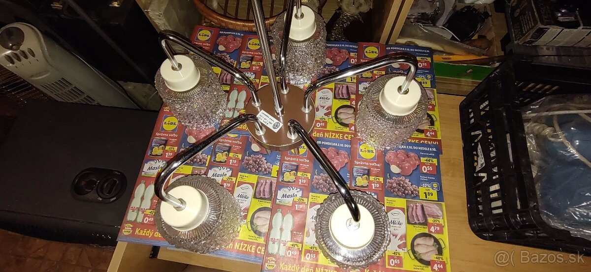 Predam tento retro luster - lampu. Velmi pekny, zachovaly stav. Brusene sklo bez poskodenia. Svietia vsetky svetla (maly, aj velky okruh), potrebne len spravne zapojit. Luster bol pekne vycisteny a osetreny. Cenu ponuknite. 0910 145 494