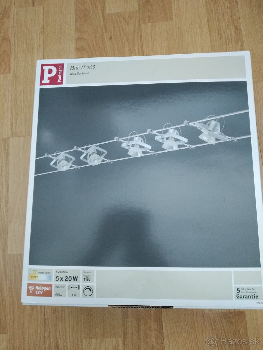 Kompletný lankový systém Mac II z kovu, kompletná sada pozostávajúca z 10 m kábla, transformátora a piatich štvorcových bodových svetiel. Tento lankový systém je jednoduchý montážny koncept, ktorý je vdaka modernej 12 V technológii bezpecnejší ako bežné 230 V inštalácie. Vodivé lanká umožnujú dlžku systému 5 m, pozdlž ktorého je možné úplne volne umiestnit pät bodových svetiel. Tieto sú otácatelné, a tým umožnujú súcasné osvetlenie rôznych objektov.