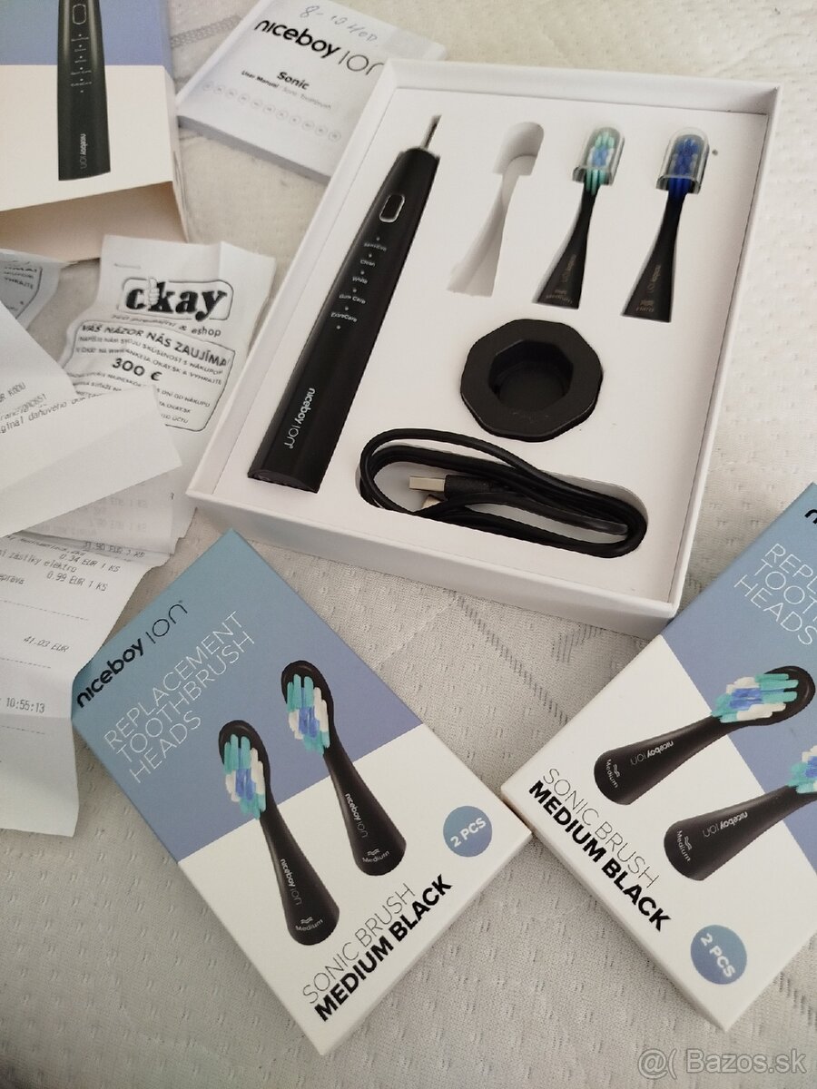 sonicka elektricka zubna kefa niceboy ion spolu so 6ks nahradne kefi, kupovana za 40€ +17€za nahradne kefi pred 2rokmi, casovac 2min. , viac rezimov sposobu cistenia,,, ele zubna kefka je uzka a lahka, sikovno sedi v ruke. kefky drzia dlho svoj tvar tak vam posluzia dlhe roky este, dam k tomu 6ks nahradne kefi.