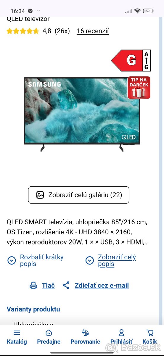 Ponúkam na predaj tv Samsung 85" QLED 4K QE85Q7FAAU. Nový, zabaleny. Záruka 2 roky. Cena 850 eur. Pozri foto.