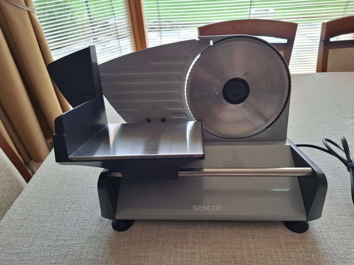 Predám 2 mesiace používaný, takmer nový univerzálny elektrický krájač Sencor SFS 4050SS ,rez. kotuc priem.190 mm z nerezovej ocele,povodna cena 55,90 ,-eur.
