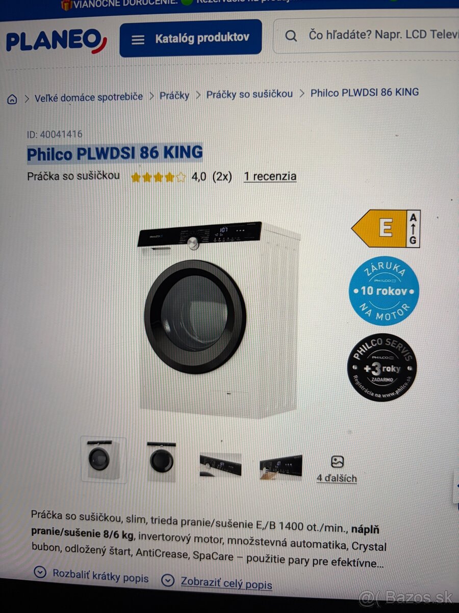 Predám ročnú práčku so sušičkou Philco PLWDSI 86 KING so zárukou. Bola používaná iba 2-3krat. Zakúpená Planeo Poprad. Doklad k záruke samozrejmosťou. Záruka na motor 10 r. + 3r. servis. Cena novej 449 EUR, teraz len 300 EUR. Cena je pevná, bez dodatočnej zľavy.