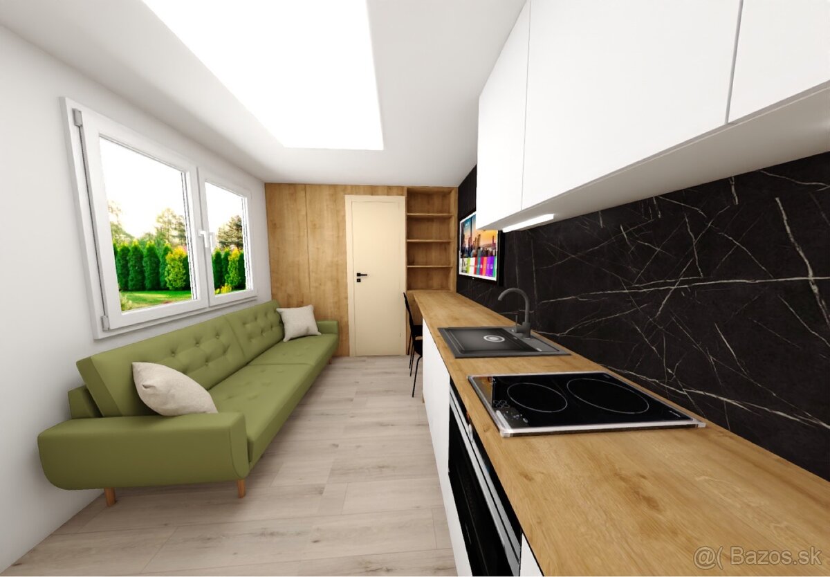 Ponúkam na predaj úplne nový mobilný dom s rozlohou 24 m², ktorý nebol nikdy používaný. Dom je moderne riešený a kompletne zariadený – všetko vybavenie a nábytok, ktoré vidíte na vizualizáciách, je zahrnuté v cene.