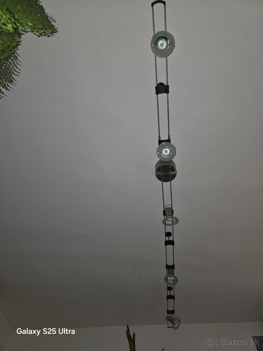 5 bodová lampa, luster, má transformátor. Žiarovky sú 16w, Dĺžka celého svietidlá je 2,5m no dá sa skrátiť aj na 1meter alebo 1,5 m.. V cene sú aj ďalšie 3 žiarovky nové nepoužite