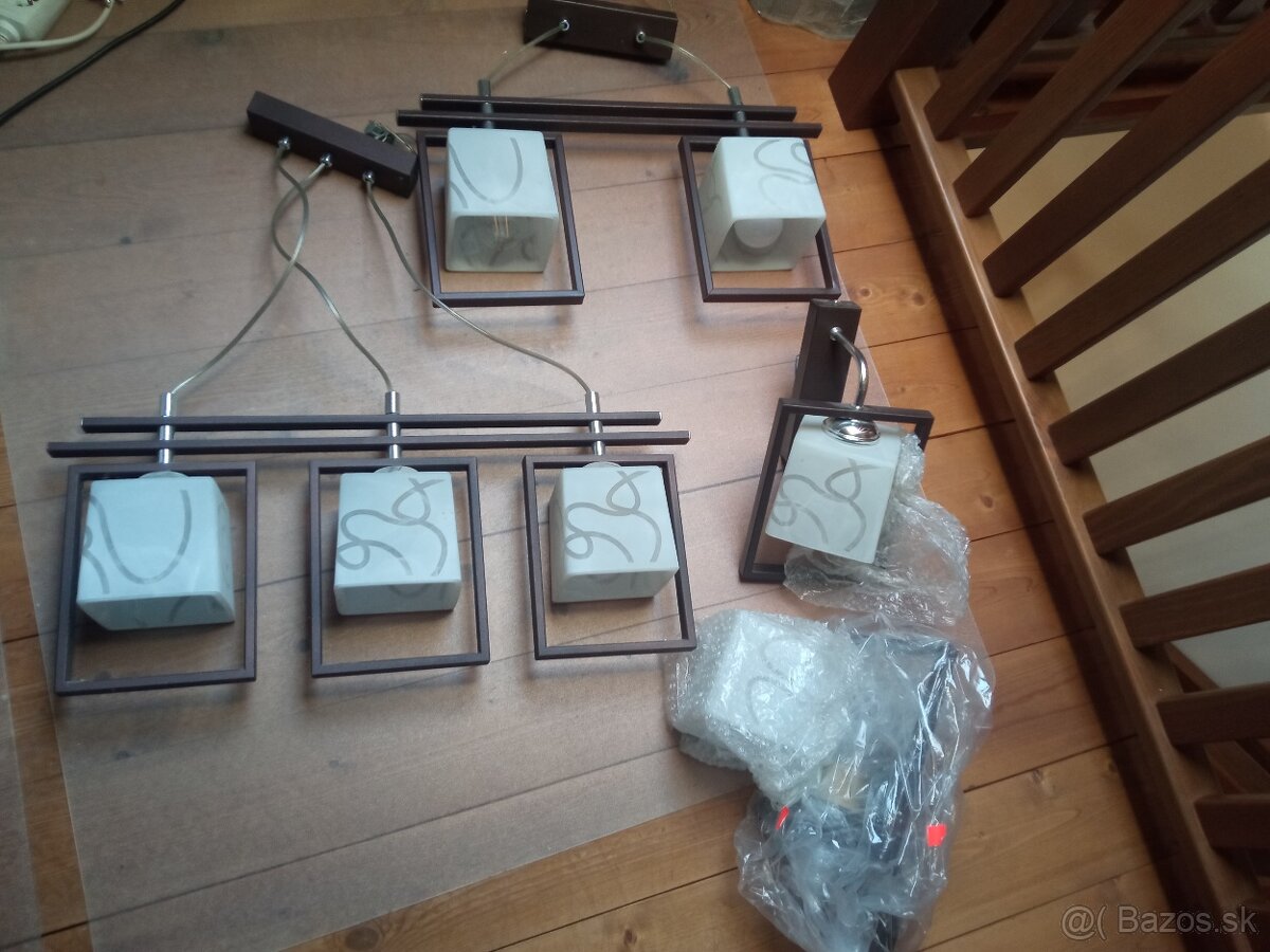 Predám 2 lustre a 2 svietidlá (lampy na stenu), ako súpravu, alebo jednotlivo. Lustre používané, lampy nie. Materiál hnedý kov a biele sklo. Trojitý luster 10,- €, dvojitý luster 7,-€, lampy po 5,-€. Do Košíc, Sniny a Michaloviec, viem doviezť.