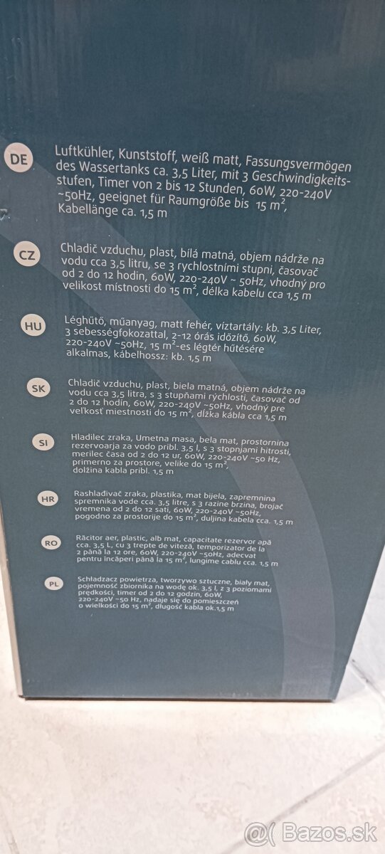 ochladzovač vzduchu • 4 v 1: letný ventilátor, ochladzovač, zvlhčovač, ionizácia • 3 rýchlosti ventilátora • 3 prevádzkové režimy • čelná mriežka s funkciou SWING • diaľkové ov ...