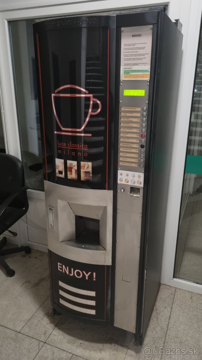 Predám funkčný, bezporuchový kávomat zn. Luce Classica Milano Rheavendors. Mincový systém s vydávaním, 7 zásobníkov na suroviny, zásobník na 300+ pohárov. Voľba množstva cukru. Čierna farba. Výška x šírka x hĺbka - 1835 x 625 x 685 mm.