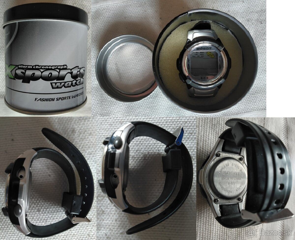 Režim 12/24h, stopky, alarm, dátum, ukazujú deň v týždni, podsvietené, silikónový čierny náramok, strieborno-čierna farba. Odlepili sa a chýbajú kryty dvoch tlačidiel, batéria je vybitá. Párkrát použité, inak odložené v originálnom puzdre.