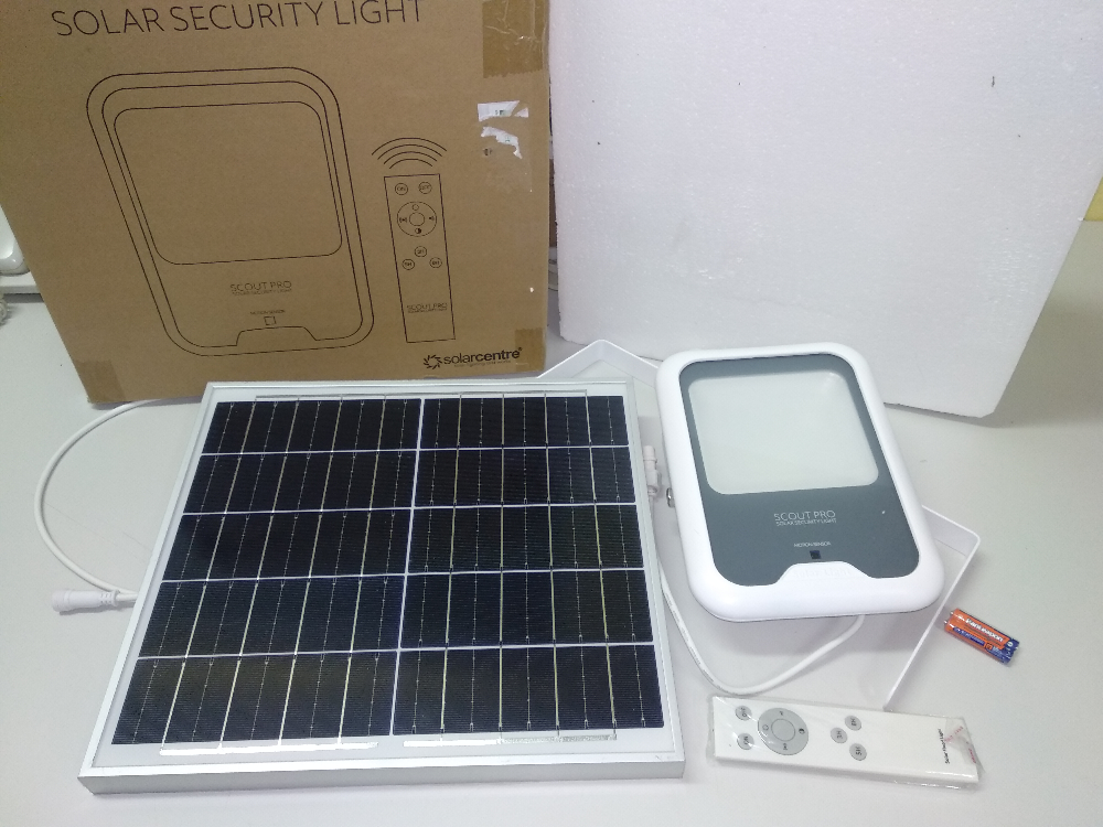 PredámE nové a nepoužité solárne nástenné PIR bezpečnostné LED osvetlenie, resp. reflektor SolarCentre model Scout Pro, KW: osvetlenie, bezpecnostne, senzorove, senzor pohybu, svetlo, svietidlo, LED, solar, nastenne, chodník, schody, zahrada, nabijatelne, vonkajsie, Samostatné diely: Solár FV panel a LED reflektor s PIR senzorom, Senzor: PIR/Šera, Osvit: do 20 m2 plochy, LED žiarovka: 24x Studená biela 3000K, Stupeň krytia: IP56, PIR senzor: 120st/ 8m, Svietenie: Mód1-7, Svietivosť: 600 lumen, Akumulátor: 4x Li-Ion 3.7V 2.2Ah=32Wh, Rozmery: FVP-360x234mm/ LED-225x170mm, Farba: Sivá, Nákupná cena: 93,90€