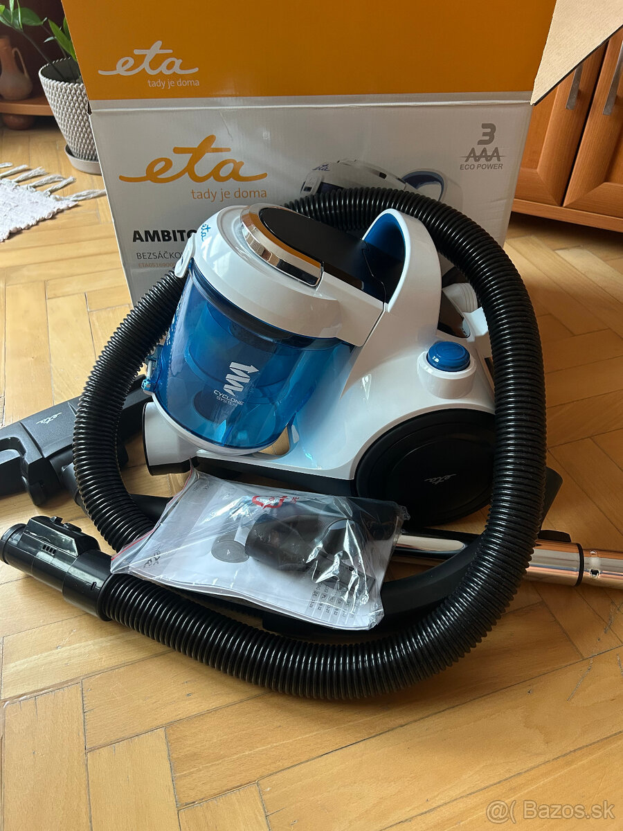 Podlahový vysávač ETA Ambito s úsporným ECO motorom. Bezvreckový, HEPA filter, príkon 700 W, 79 dB, objem prachovej nádoby 1,5 l, akčný rádius 8 m, dĺžka napájacieho kábla 5m, otočné koliesko o 360° na jednoduché otáčanie vysávača, mäkčené kolieska.