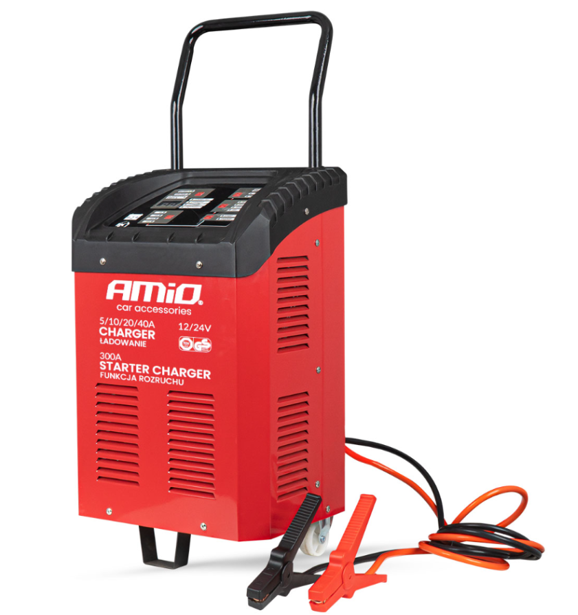 Nabíjačka AMiO s funkciou štartu je moderné, mikroprocesorom riadené zariadenie určené na nabíjanie a pomoc pri štarte 12V a 24V akumulátorov.