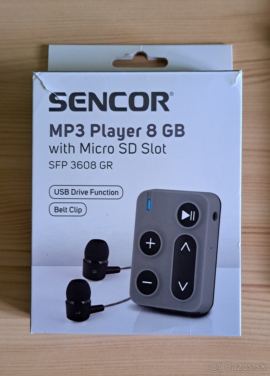 MP3 Sencor 8 GB SFP 3608 GR s príslušenstvom - AUX kábel, USB nabíjací a dátový kábel. Možnosť pripojiť do auta alebo na slúchadlá s AUX koncovkou. Cena 10 eur.