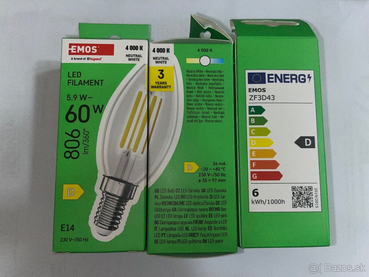 3 ks nové LED žiarovky od českého výrobcu EMOS, 5,9W alternatíva k 60W žiarovke, farba neutrálna biela, svietivosť 806 lm, životnosť 25 000 hod, závit E14