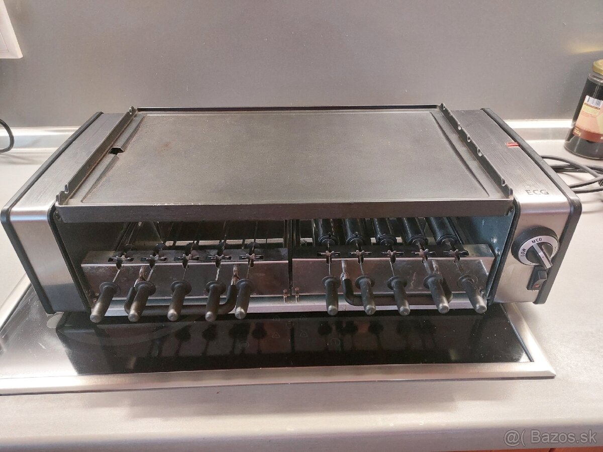 odnímateľná obojstranná doska 2v1 s nepriľnavou povrchovou úpravou, 10 ihiel na špízy, 5 valčekov na prípravu párkov, aut. otáčanie ihlíc a valčekov, 3-stupňový regulátor teploty (120-230 °C), integrovaná nádobka na šťavu, vyberateľné zásuvky na olej, príkon 1600 W.