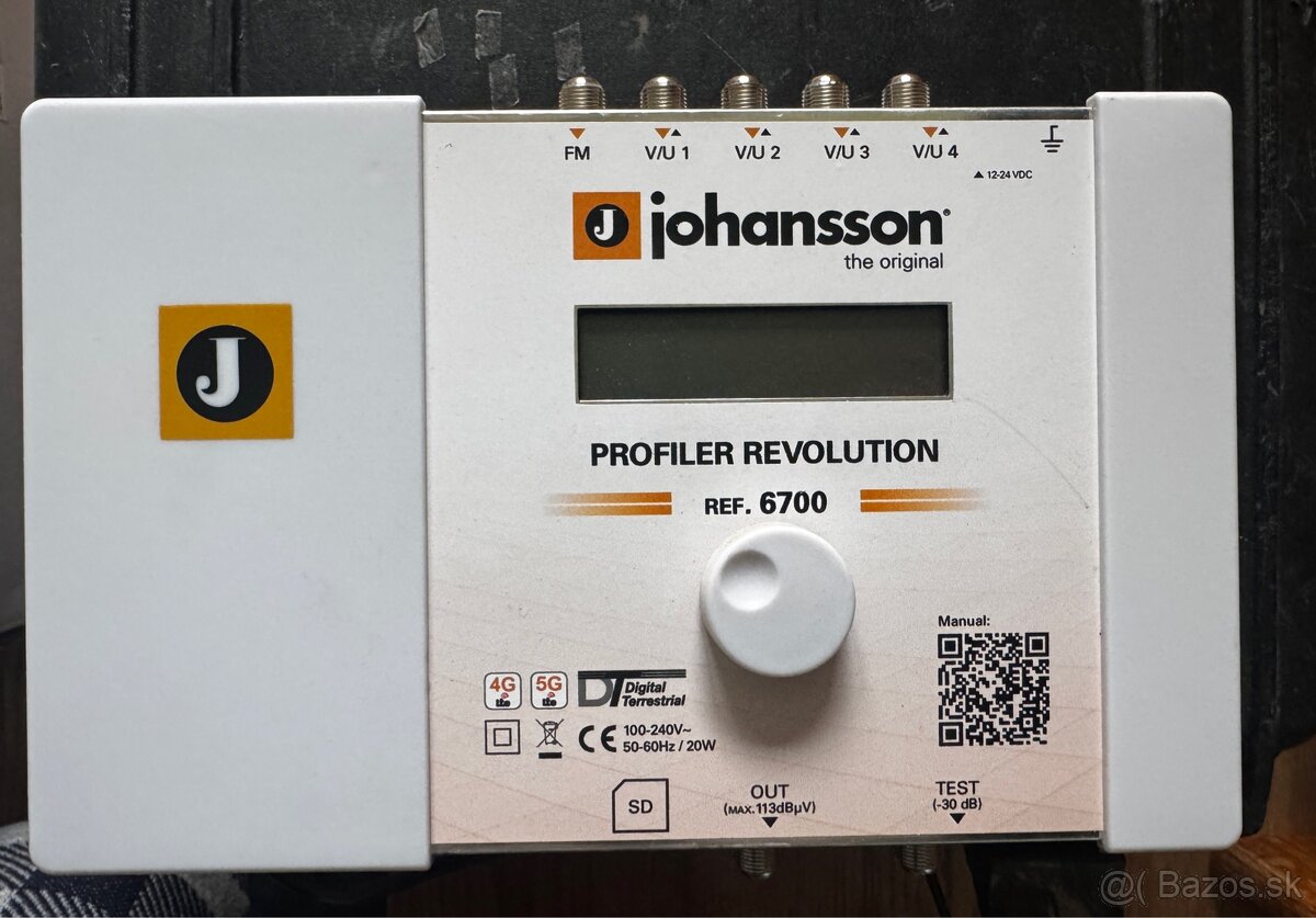 Programovateľný zosilňovač je určený pre rozvody STA, ITR. Johansson Profiler Revolution 6700 je ľahko použiteľný programovateľný zosilňovač a kanálový konvertor (menič kmitočtu) pre pozemné VHF / UHF a FM signály z niekoľkých vstupov s cieľom poskytnúť vysoko kvalitný signál. Zosilňovač disponuje piatimi vstupmi: 1x FM + 4x VHF / UHF. Zosilňovač sám detekuje najvyššej TV kanál pripojený do vstupu a podľa toho zaraďuje vstupný filter typu horná zádrž pre obmedzenie rušenia v pásme 5G, 4G (LTE) alebo je filter vypnutý pri príjme TV kanálov nad 790 MHz. Zosilňovač automaticky načíta a zobrazí úroveň signálu zvoleného TV kanálu, to znamená, že pri nastavovaní nepotrebujete merací prístroj. Zosilňovač umožňuje frekvenčnú konverziu akéhokoľvek vstupného TV kanála v pásmach VHF a UHF na akýkoľvek iný TV kanál v pásmach VHF a UHF, čo je výhodné pre rôzne hotely a penzióny, kde majú rozsiahle rozvody na vysokých kmitočtoch veľký útlm. V jednotlivých TV kanáloch (alebo klastroch) je automaticky v reálnom čase (do 20 sekúnd) regulovaná úroveň signálu pomocou AGC, tak aby na výstupe zosilňovača boli úrovne konštantný. Zosilňovač umožňuje spracovať viac ako 50 TV kanálov. Ak požadujeme konverziu kmitočtu, môže byť v klastri len jeden TV kanál. Na výstupe zosilňovača je možné zaradiť náklon 9 dB (oproti referenčnému kmitočtu 174 MHz) pre kompenzáciu útlmu rozsiahleho televízneho rozvodu na vysokých kmitočtoch. Do vstupov zosilňovača je možné pripojiť externý predzosilňovača, potom je nutné v Menu zapnúť napájať predzosilňovače + 12V alebo + 24V. Nastavenie celého modulu zosilňovača je možné uzamknú heslom proti neprávněným zmenám a tiež je možné nastavenie uložiť na SD kartu a pri nastavovaní iného modulu tieto parametre opäť načítať z SD karty. Je možné taky cez SD kartu vykonávať upgrade softvéru.