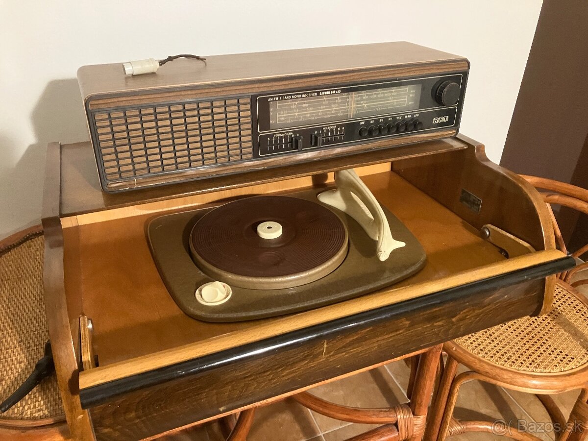 Predam gramofon Supraphon model S16 z roku 1958 v povodnom stave v drevenej skrinke. K nemu na reprodukciu zvuku sa pouziva Radio Saturn MR 423 z roku 1982. Predavame spolu.
