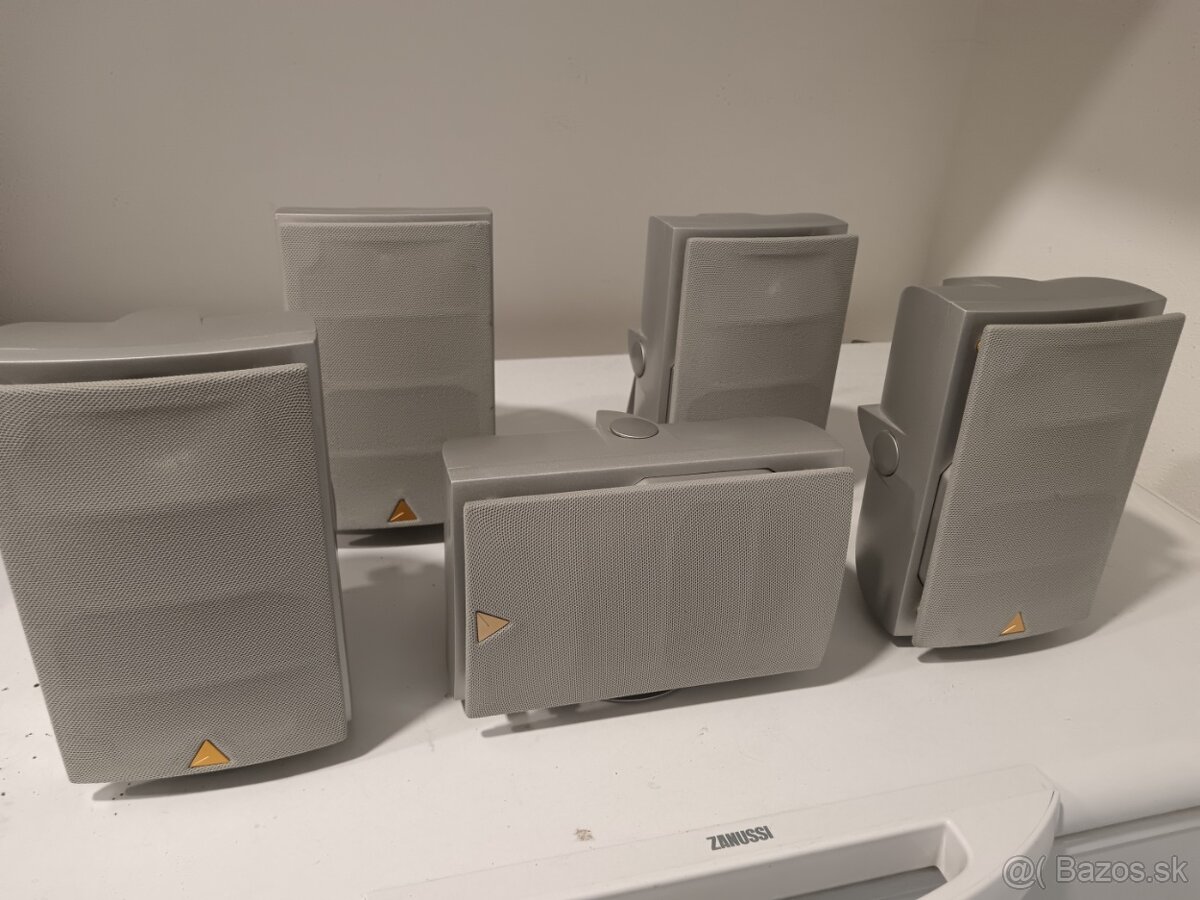 Predám krásny systém Triangle 5.1, 2,5kg lakovanú hliníkovú jednotku s 25mm titánovým výškovým reproduktorom a 120mm stredobasami pre výkon 75W RMS 8 Ohm s účinnosťou 90db, výborný moderný dizajn, tri samostatne stojace jednotky a dve s originálnym nástenným držiakom. mierne ošúchanie laku na obvode jedno kus, opravené, na viac ako meter prakticky neviditeľné, pozri foto,