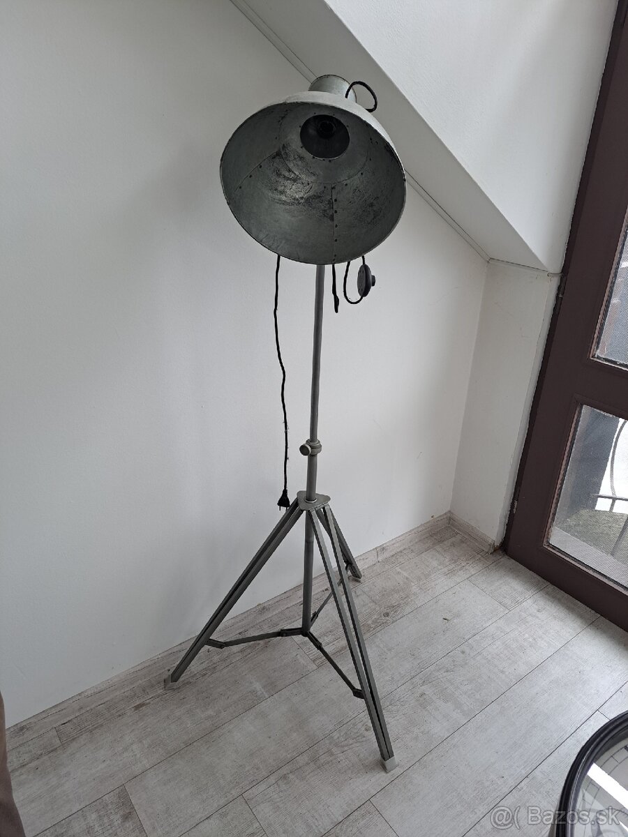 Predam zachovalu retro plechovu lampu na trojnožke pekny doplnok do prace alebo bytu nachadza sa v puchove výška 154cm priemer kornuta 33cm