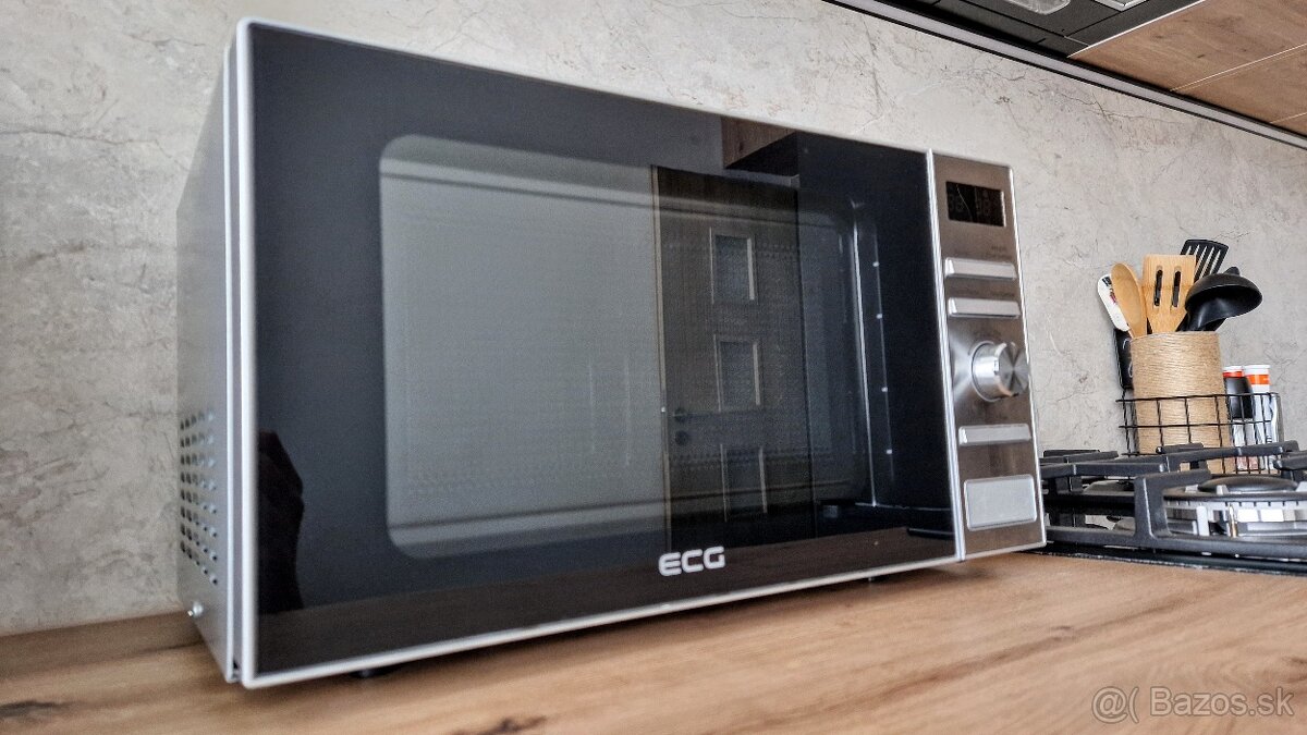 Používana mikrovlnná rúra značky ECG, ale stále v dobrom stave. Nedostatky: nefunkčné svetlo vo vnútri mikrovlnky a jemné škrabance z používania.