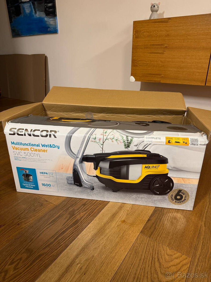 Viacúčelový vysávač – na všetky typy podláh, pre alergikov a antibakteriálny, na mokré čistenie, automatické navíjanie kábla, indikátor plného koša, regulácia výkonu, čistiaci systém, pogumovaná rukoväť, mäkčené kolieska a umývateľný filter, HEPA, ovládanie na tele, dĺžka kábla 6 m, akčný rádius 9 m, teleskopická trubica, nádobka na vodu, filter, filtračné vrecko a filtračný kôš súčasťou balenia, hlučnosť 90 dB, žltá a čierna farba