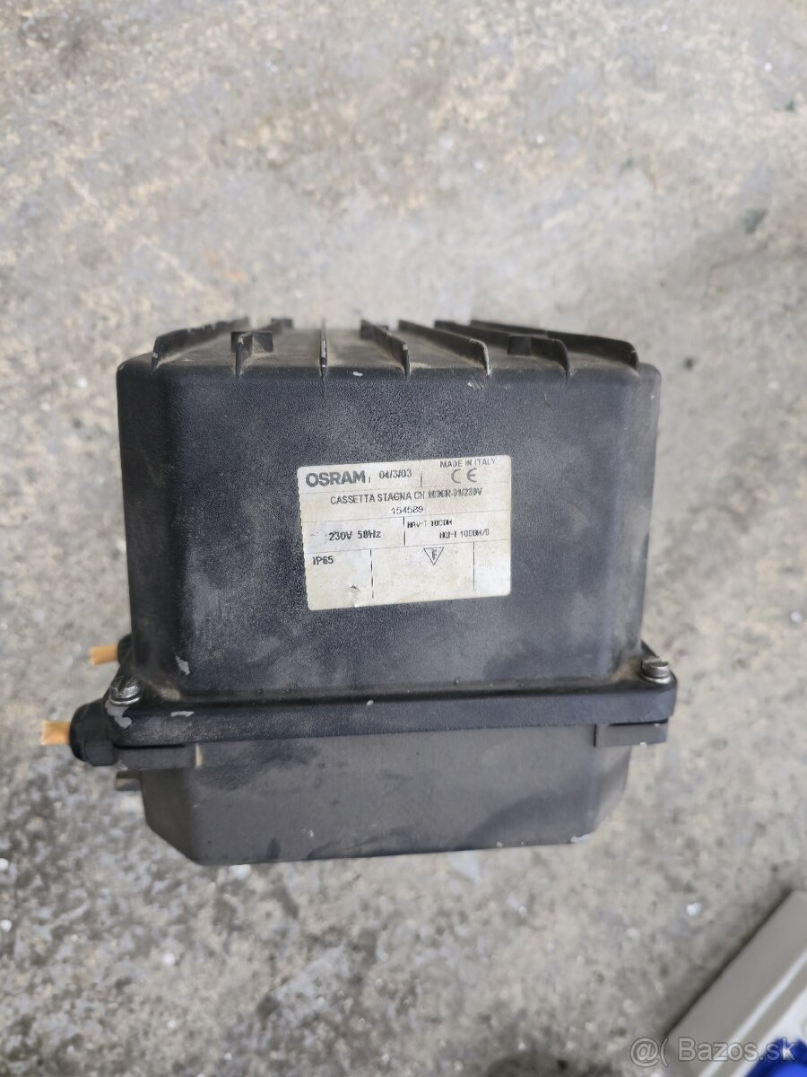 Predradná skriňa OSRAM pre 1000W výbojky metalhalogen HQI-T HQI-E MHN-LA MHN-SE 1000W a sodíkové NAV-T NAV-TS 1000W a SON-T 1000W. Dnu je tlmivka a kompenzácia účinníku. Zapaľovač býva pri vybojke, mám.