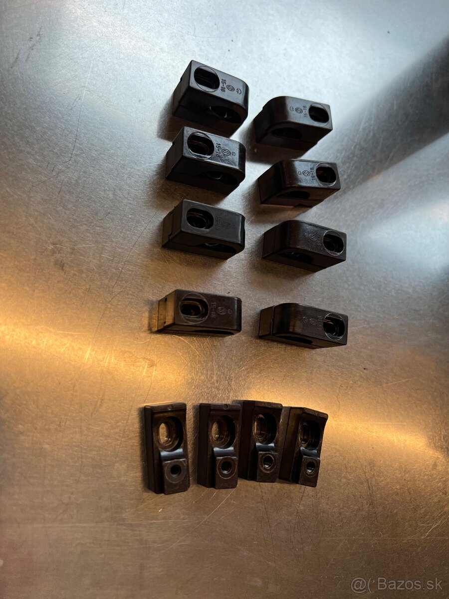 Predám dvojdielne jednostranné bakelitové príchytky na kábel, 8ks komplet a 4ks spodky.