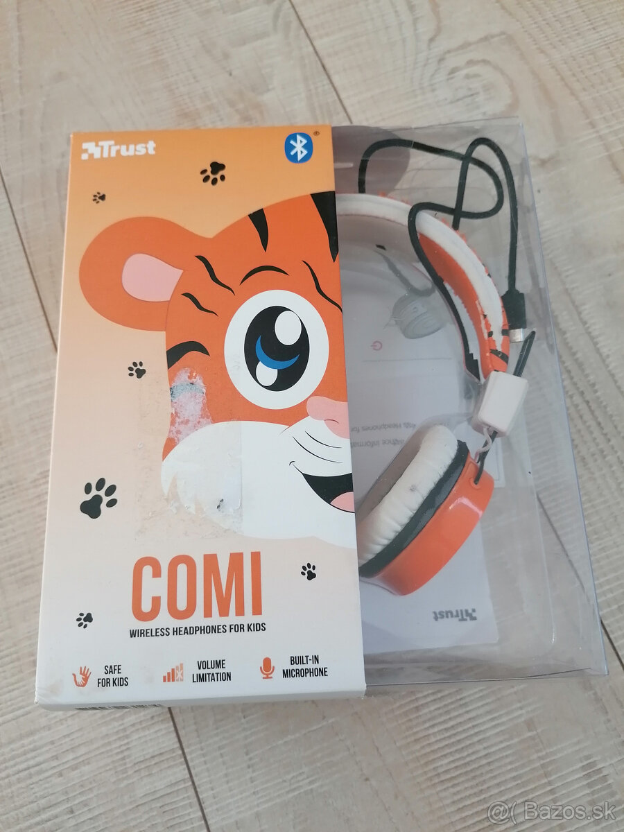 Predám detské bezdrôtové slúchadlá Trust COMI. Plne funkčné. Nastaviteľná veľkosť, wifi bezdrôtové pripojenie, s mikrofónom, safe for kids - obmedzenie hlasitosti. Komplet balenie. Zošúchaný tigrový vzor, ako vidno na fotkách.