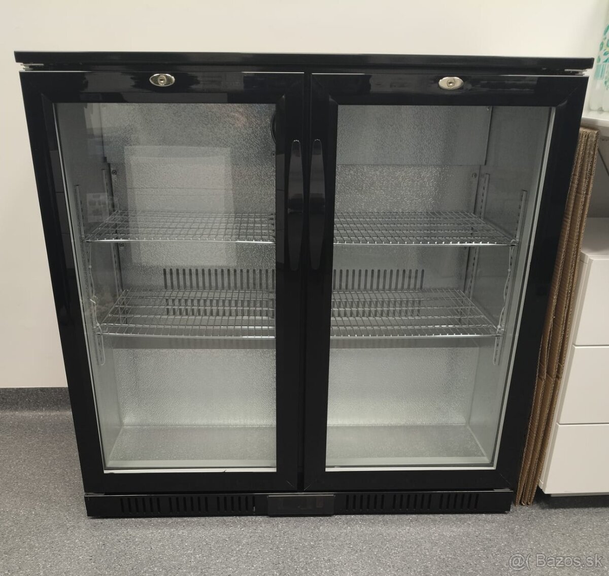 Rozmery: 90 × 50 × 85 cm, kapacita 220 l, 2 sklenené dvere.