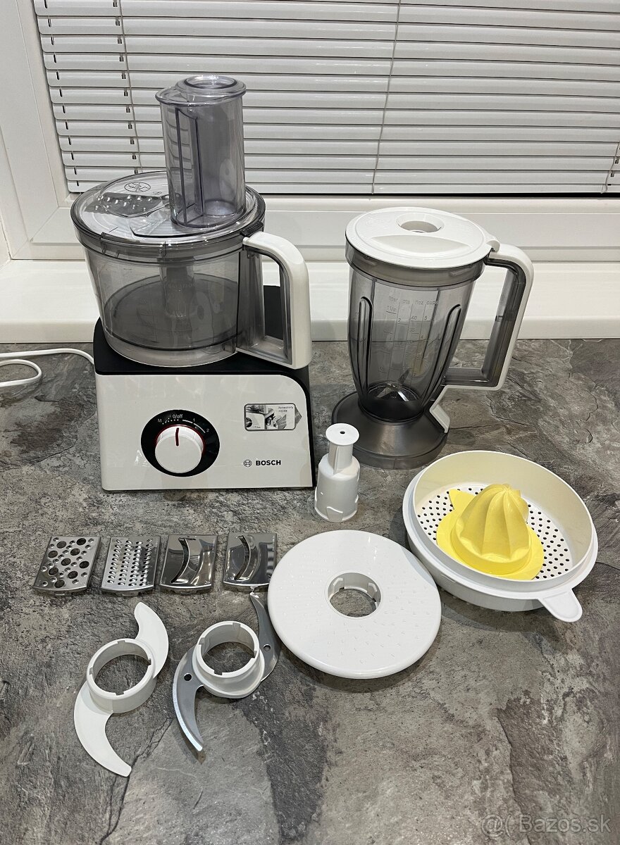 Kuchynský robot Bosch MCM4100 s funkciami krájania, strúhania, mixovania či lisovania na citrusy. Ovládanie je mechanické gombíkové, disponuje dvomi rýchlostnými stupňami, momentovým stupňom, pulzným spínačom či možnosťou zablokovania veka.