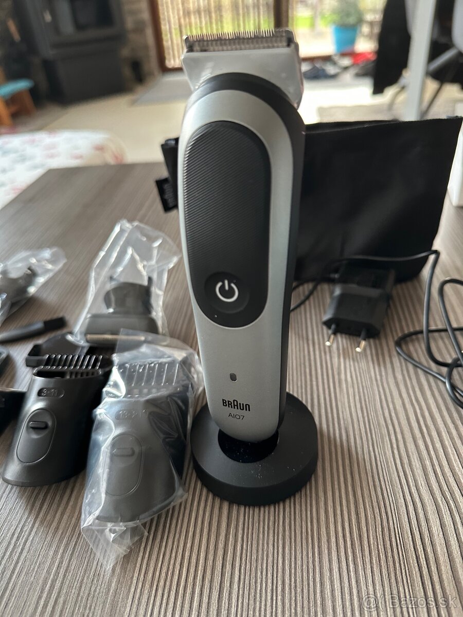 Predam novy (raz pouzity) zastrihavac Braun Series 7 AIO5807. Cena noveho 95,10 € kupeneho v 01/2026. Sada obsahuje komplet prislusenstvo vratene obalu (tasky).