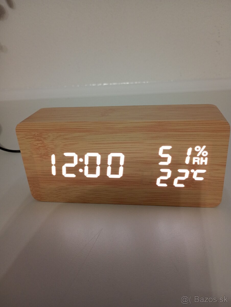 Funkcie:dátum,hodiny,budík,teplota v stupňoch Celzia alebo Fahrenheita, vlhkosť,alarm,3 úrovne jasu displeja, ovládanie obrazovky zvukom,obrazovka biele LED diódy, úsporné po dlhšej nečinnosti displej zhasne s hlasom ho môžete opäť aktivovať,sú moderné štýlové s imitáciou dreva.