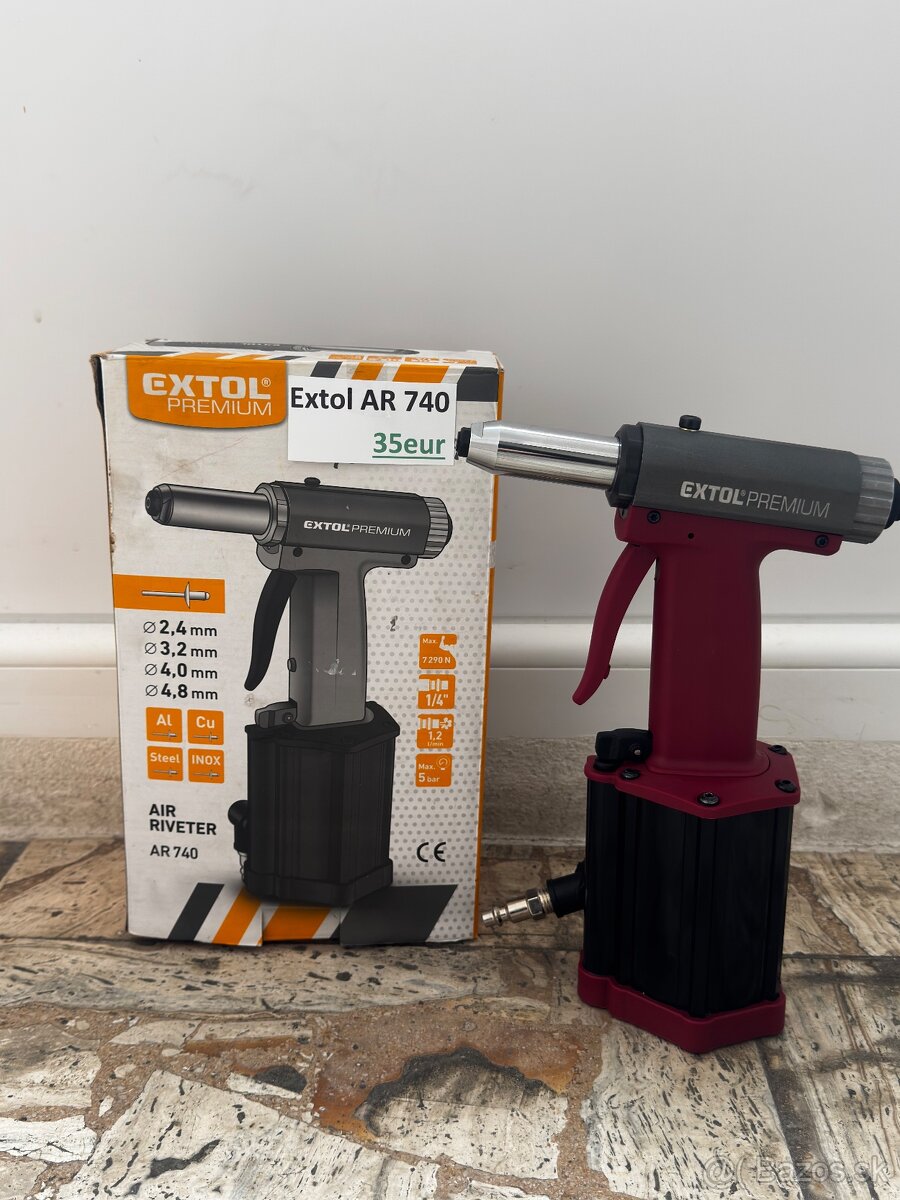 Predám výkonnú pneumatickú (vzduchovú) nitovačku značky Extol Premium, model AR 740. Náradie je vo výbornom stave, vizuálne top stav pripravené na prácu. Ideálna pre prácu s trhacími nitmi z hliníka, medi, ocele aj nerezovej ocele.