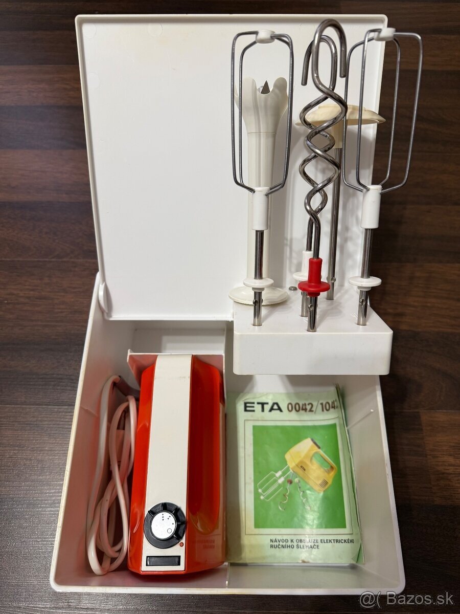 Predám retro ručný šľahač ETA 0042 s kompletným príslušenstvom. Šľahač je plne funkčný, v krabici sa nachádza návod na použitie a aj dobový záručný list a účtenka.