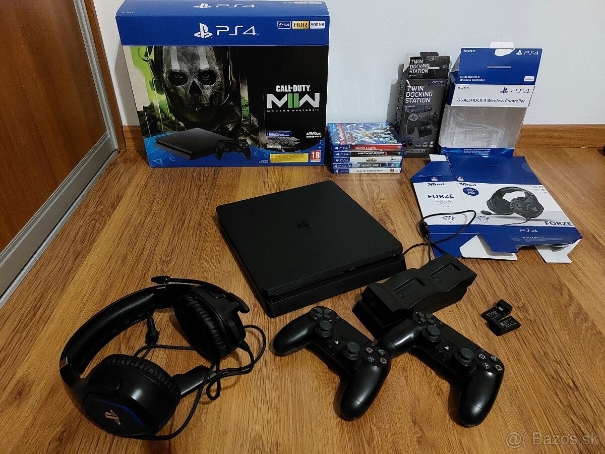 Ponúkam hernú konzolu Sony Play Station 4 slim, 500 GB, spolu s príslušenstvom: 2 ks dualshock ovládače, jeden stále v záruke, dokovacia - nabíjacia stanica na ovládače a herné slúchadlá Trust. Ku všetkým položkám sú aj krabice a káble. Bez škrabancov, bezchybný veľmi pekný stav (iba na slúchadlách nefunguje mikrofón).