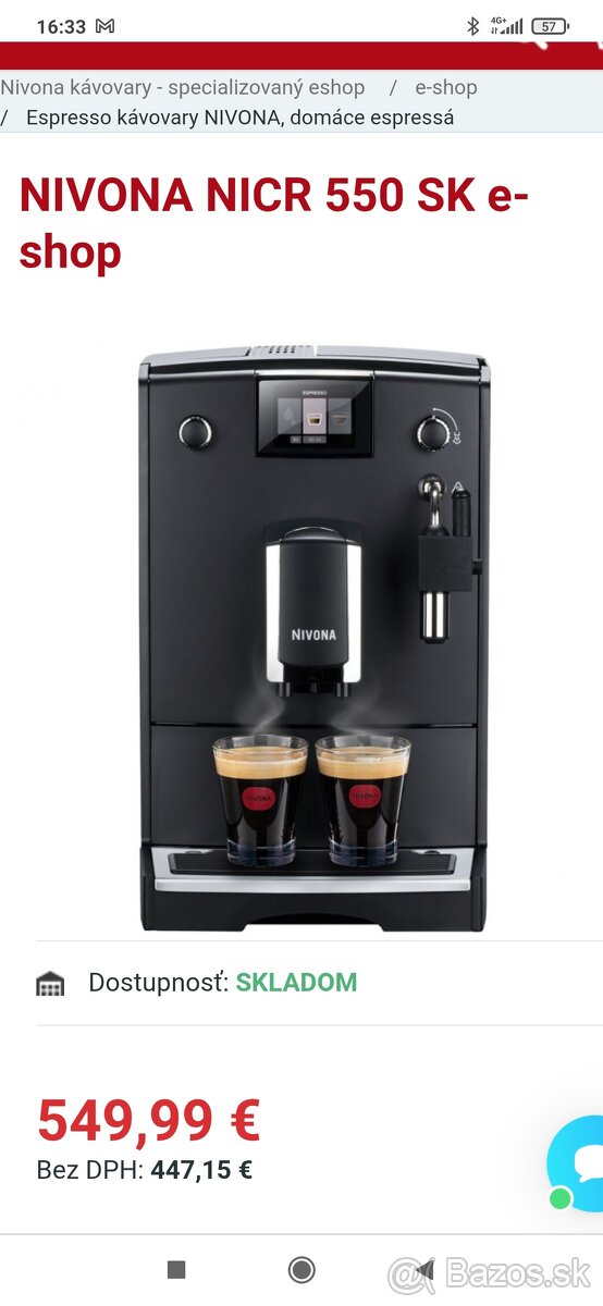 Predám kávovary nivona model 550. Jeden ako nový (cca 200káv) cena 380€, druhý (okolo4000kav) cena 330€. Obidva v top stave. Viac info 0949787346. Možnosť dovozu na trase ZA-BA.