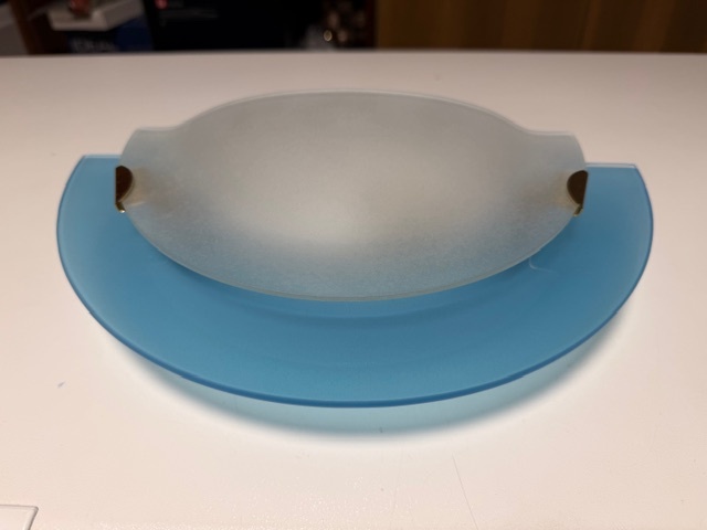Nástenné svietidlo je vyrobené z plechu a ohýbaným sklom, sklo je k základni pripevnené kovovým držiakom. Priemer 300 mm, 1 x E27 / 230 V. NOVÉ, nepoužité.