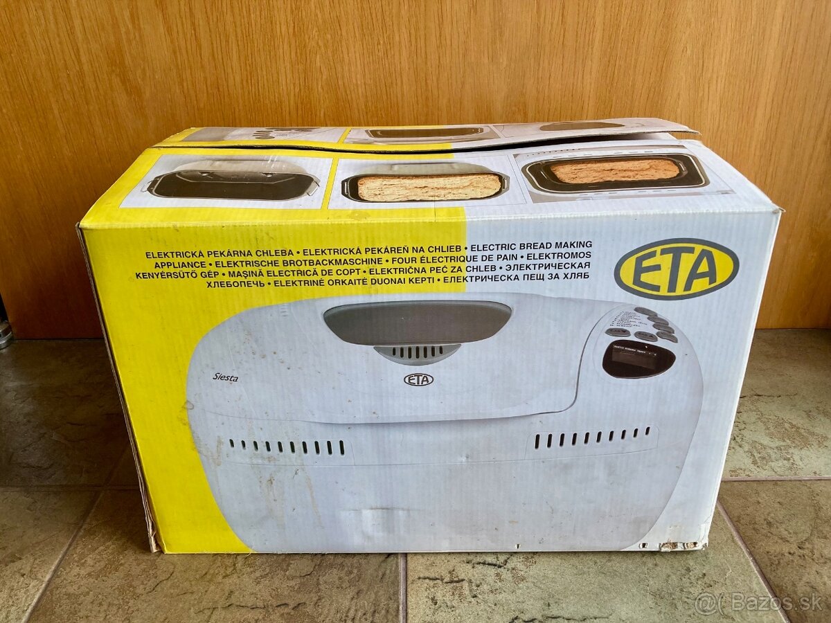 Predám staršiu domácu pekáreň, vôbec nepoužitá, len rozbalená. Domáca pekáreň ETA Siesta 0149 90000 upečie čerstvý chlieb o hmotnosti až 1300 g podľa vášho priania. Pomocou 10tich programov pripraví rôzne druhy chleba vrátane bezlepkového, uvarí lahodný džem. Pomôže aj s prípravou tortových korpusov, cesta na pizzu, bagiet, či praclíkov. Priebeh programu môžete sledovať na LCD displeji, zvukový signál pred zahájením samotného pečenia upozorní na možnosť pridania ďalších ingrediencií.