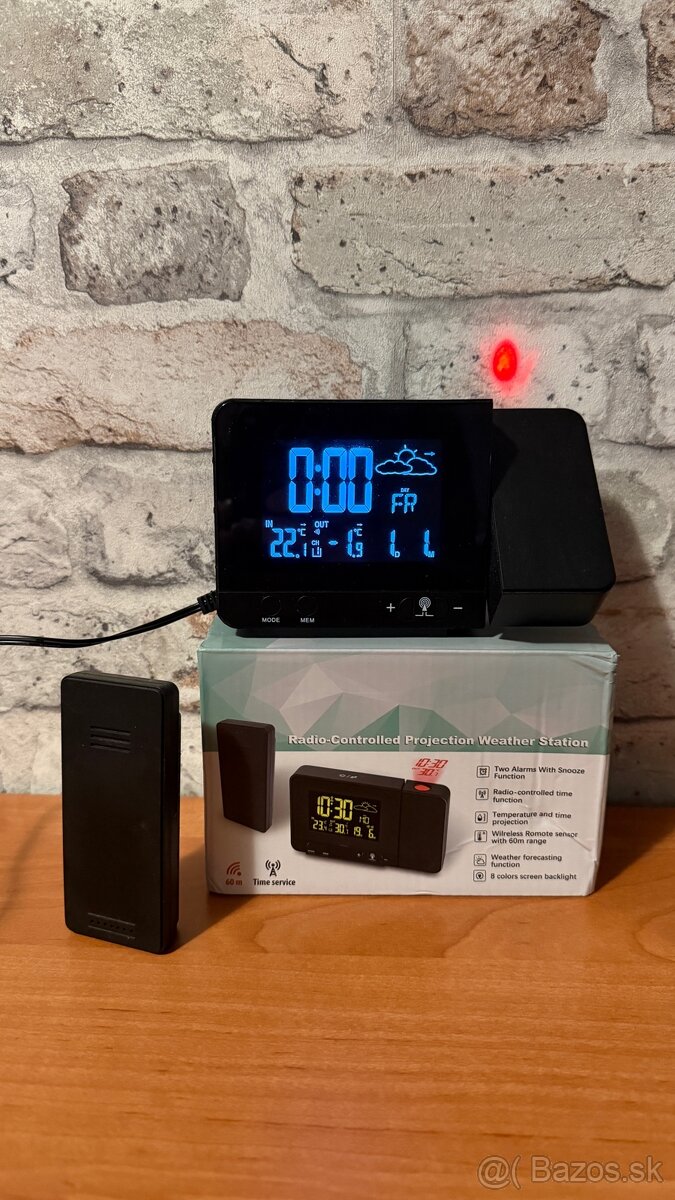 Hodiny s projektorom a predpoveďou počasia, majú aj vonkajší senzor teploty a radio meteo-stanicu, možnosť nastavenia budíka, synchronizácia času cez DFC77, sú používané, plne funkčné.