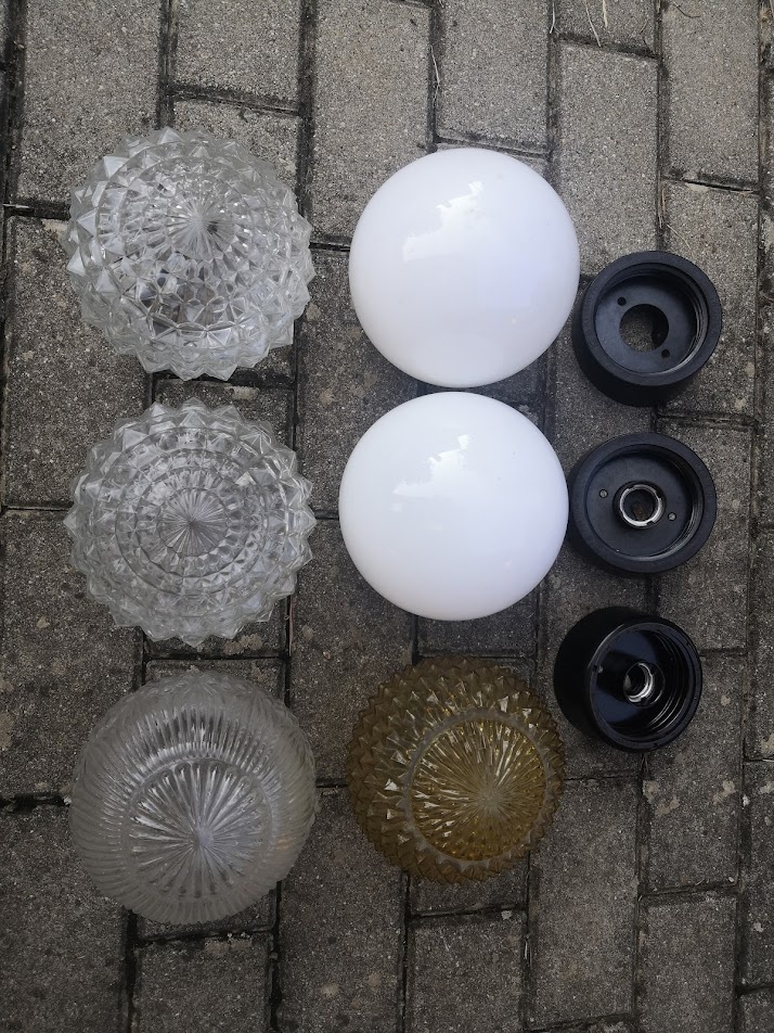 Predám nástenné guľaté svietidlá: 1 ks matné sklo, 4 ks ozdobné sklo, 3 objímky.