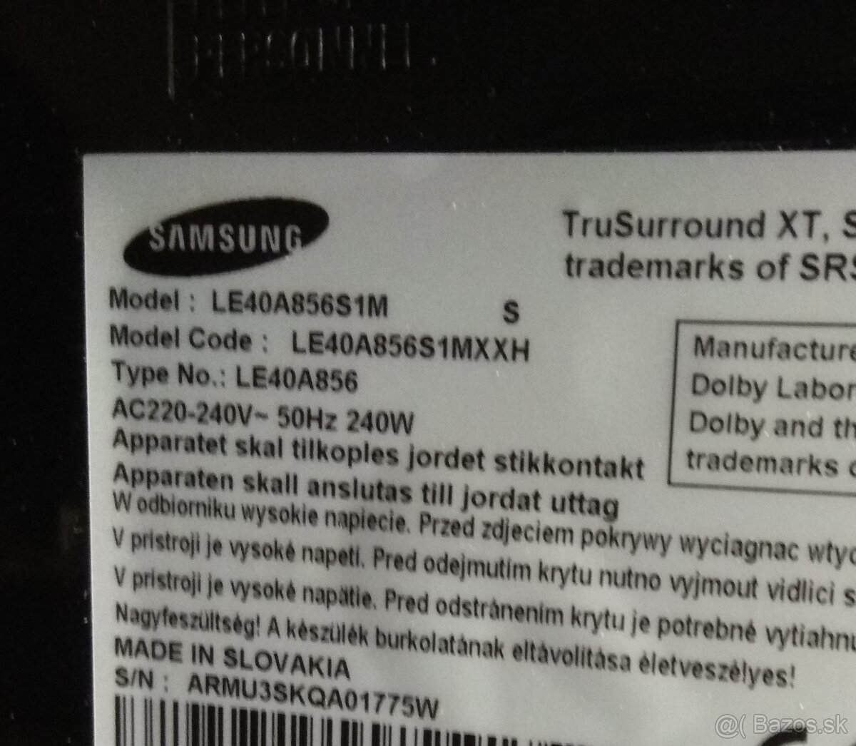 Predám diely z TV Samsung LE40A856. Okrem obrazovky by malo byť všetko funkčné. TV sa dá zapnúť, meniť nastavenia hlasitosti a pod. Ale má veľa farebných pruhov na obrazovke.