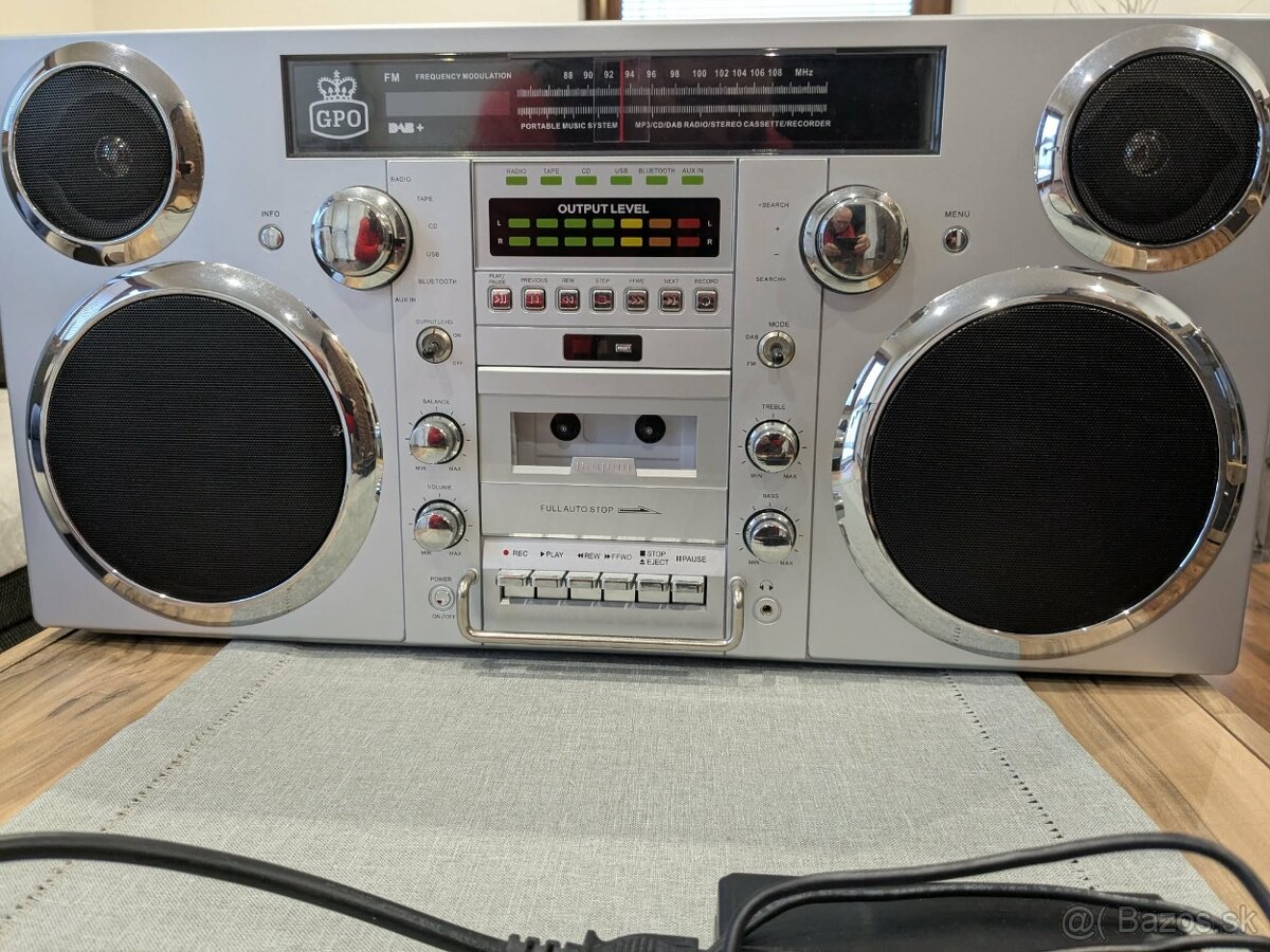 Štýlový retro audio systém s nesmrteľným 80s dizajnom. GPO Brooklyn prináša obľúbený Boombox späť do hry. Tento plne prenosný audio systém je osadený zosilňovačom s výkonom 2x 40W a dobíjateľnou lítiovou batériou, vďaka ktorej si svoju hudbu môžete zobrať kamkoľvek a užívať si ju nepretržite až 4 hodiny. Systém prehráva štandardné CD, DAB/FM rádio, no k dispozícii je aj klasický kazetový MC prehrávač s funkciou nahrávania. Samozrejmosťou je USB port pre prepojenie s počítačom, Aux vstup pre pripojenie externých zdrojov hudby a technológia Bluetooth pre bezdrôtové prehrávanie hudby zo smart zariadení. O prehľad o celkovej hlasitosti sa postará spínateľný LED svetelný bar so 7 segmentami. Dokonalý vzhľad 80. rokov dopĺňa praktická rúčka určená na prenášanie zariadenia. Rozmery: 60 x 14 x 30 cm, hmotnosť: 10 kg poštov neposielam