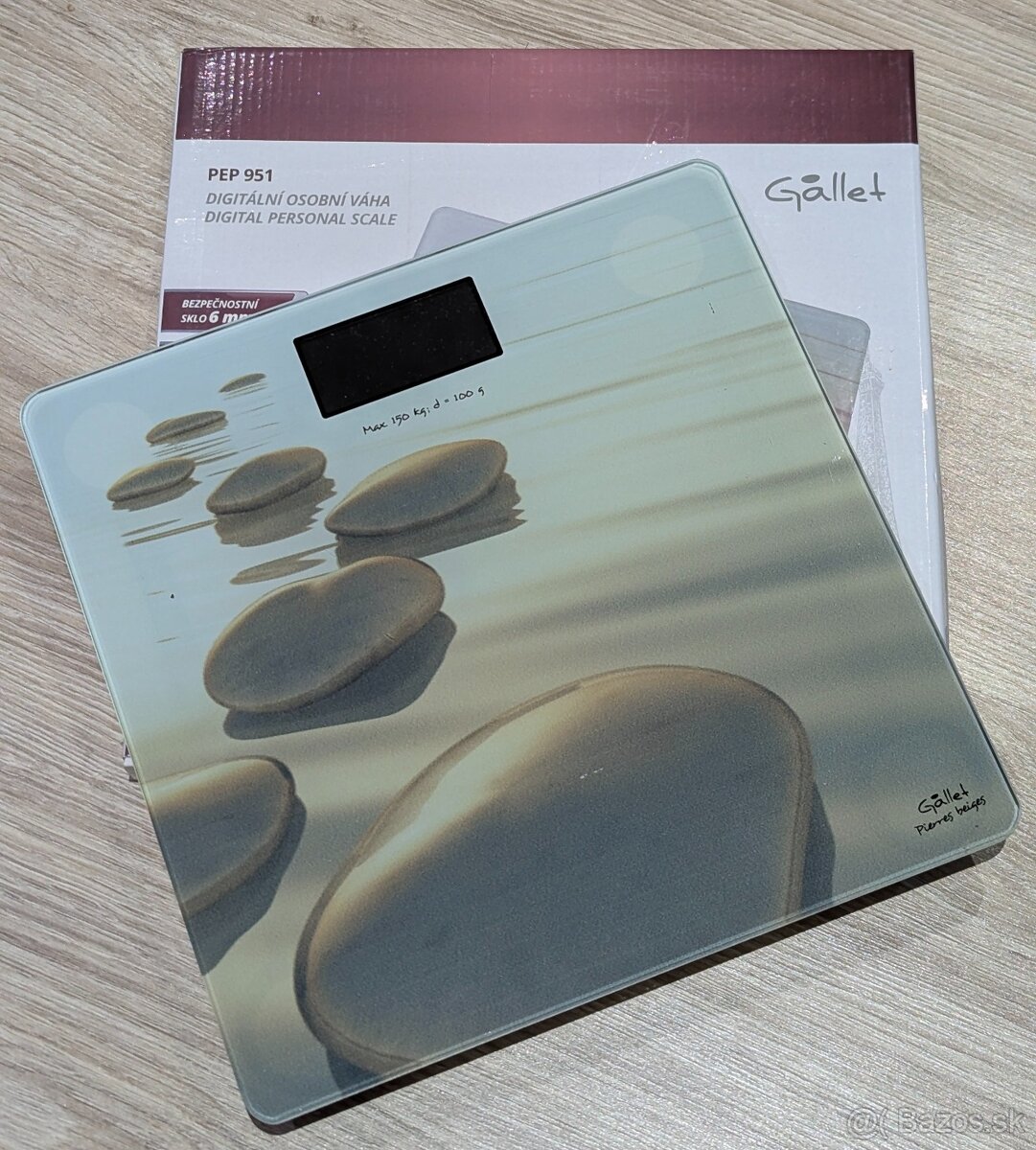 Presná osobná váha Gallet PEP 951 v béžovom prevedení s foto-motívom váži s rozlíšením na 100 g až do 150 kg. Je vybavená sklenenou vážiacou plochou z bezpečnostného skla s hrúbkou 6 mm a umožňuje váženie buď v kilogramoch, stone alebo librách.