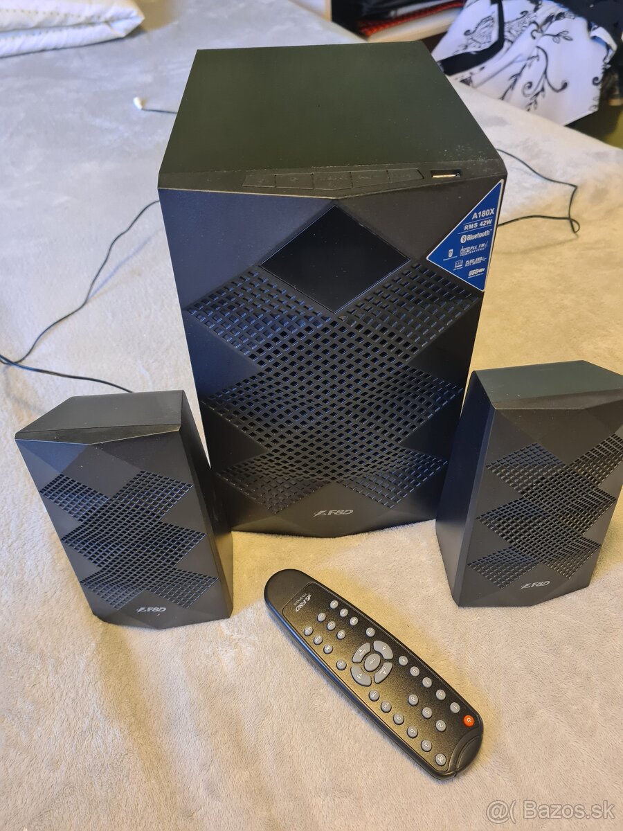 Fenda F&D A111X - [30.1. 2026]Predám tieto reproduktory v konfigurácii 2.1 s celkovým výkonom 35 W. Reproduktory majú integrovanérádio s PLL a pamäťou na 100 staníc. Hudbu je možné prehrávať aj cez USB port, podporované sú formátyMP3 a WMA. Okrem klasickéhodiaľkového ovládania , ktoré je súčasťou balenia, možno reproduktory ovlá ...