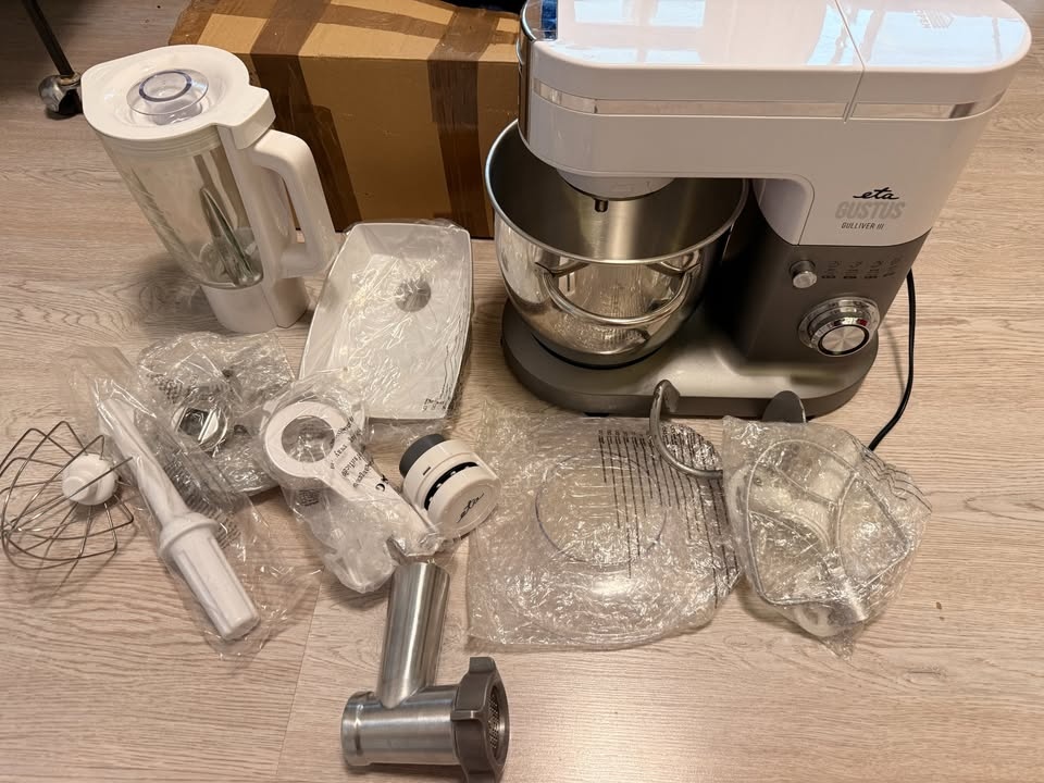 Predám kuchynský robot ETA Gustus Gulliver III .1200W Motor. Robot ma 3 roky, používaný na miesenie cesta z hákom a občas mlynček na mäso + brúsenie nožov.