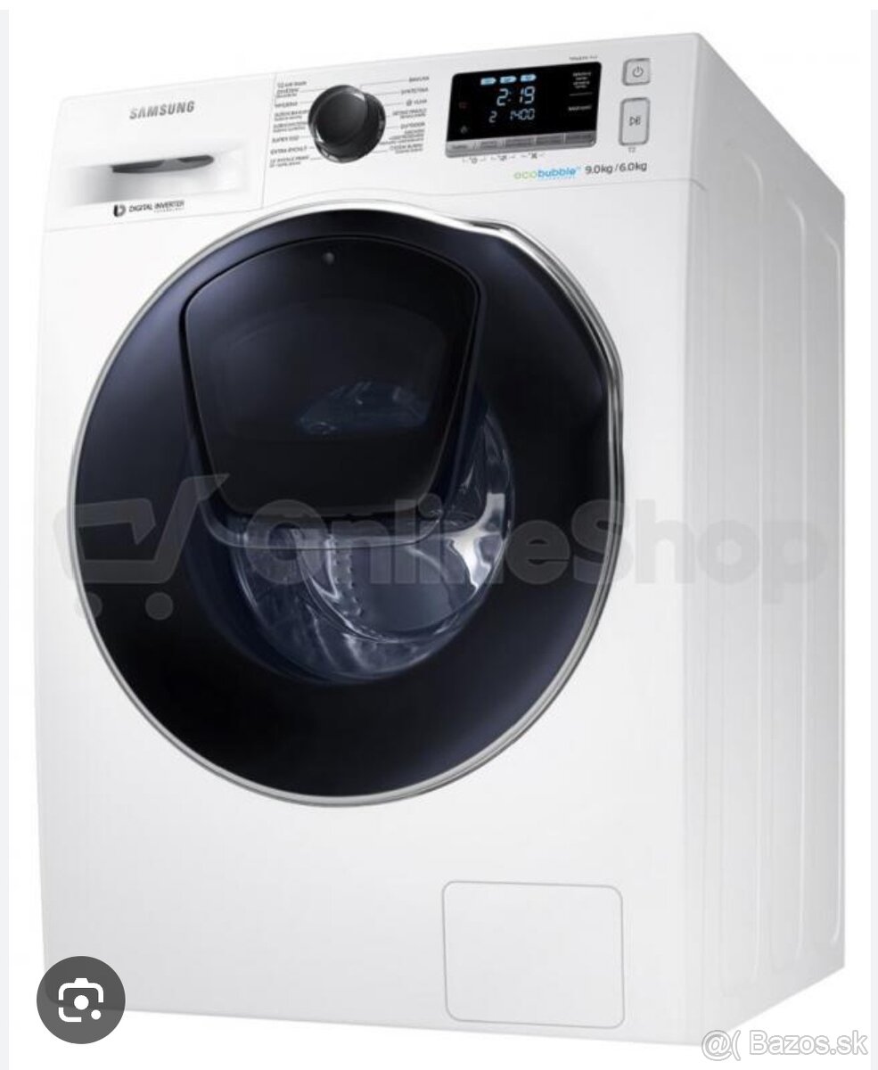 Samsung WD90K6400OW predom plnená práčka so sušičkou • energetická trieda A • kapacita 9 kg pri praní • kapacita 6 kg pri sušení • hlučnosť 54 dB pri praní, 73 dB pri odstřeďovaní • 1 400 ot/min • keramické výhrevné teleso • dvierka AddWash pre vkladanie prádla behom prania • detská poistka.Rozmery 60cm-sirka,85cm-vyska,65cm-hlbka.