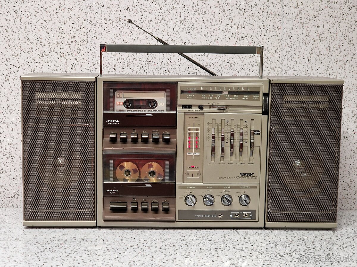 Predám radiomagnetofon s oddelitelnymi reproduktormi a s dvoma kazetovými mechanikami bez poskodenia. Radio - tuner hra a ladí veľmi dobre, kazetove mechaniky sú ku údržbe, slabšie pretáčajú, vrchná pekne prehráva, spodná žuje pásku.