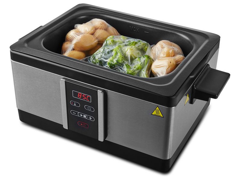 Pomalovarný suvidovač - Sous Vide 5,5l pomalý elektrický varný hrniec. Nové, nepoužité, nerozbalené balenie s návodom a zárukou. Kompaktný ale výkonný:550W. Sous-Vide - nízkoteplotné pečenie, varenie, ohrievanie so zachovaním všetkých nutričných vlastností potravín. Zdravé profi-varenie vo vákuovom vrecku vo vodnom kúpeli, nerezové telo prístroja, časovač a presná elektronická regulácia teploty umožňuje šetrné varenia pričom prevarenie je prakticky nemožné, potraviny zostanú šťavnaté, ich farba a aróma sa prípravou ešte zintenzívni. Nedochádza k vysúšaniu, k oxidácii ani k vylúhovaniu potravín. Vďaka šetrnej tepelnej úprave zostanú zachované dôležité živiny. Vyčarujete s ním šťavnaté steaky, chrumkavú zeleninu alebo aromatické pokrmy z rýb bez pripálenia. Sous-vide alebo vákuové varenie je šetrná metóda používaná od 70. rokov profesionálnymi kuchármi, ktorá bola doteraz pre domácnosti nedostupná pre vysokú cenu zariadení. Stačí zabaliť požadovaný produkt na varenie - mäso, ryby, zeleninu, ovocie, vajíčka, jogurt... spolu s korením alebo marinádou do vákuového vrecúška bez nutnosti pridania tuku a nastaviť čas varenia a teploty na zariadení- viac ako 20 odporúčaní nájdete v priloženom návode. Potraviny sa šetrne varia vo vlastnej šťave, čím sa zachová chuť, aróma či vitamíny a nedochádza k nezdravému pripáleniu. Vďaka tejto úprave bude chuť pridaných byliniek a korenín výraznejšia a mäso jemnejšie. Varné sáčky je možné pohodlne zamraziť prípadne dosmažiť na grile či panvici. Výkonných 550 W prináša odnímateľný, nepriľnavý vnútorný hrniec zariadenia rovnomerne na teploty 40 až 99 °C +/-2°C a zaisťuje šetrné a zdravé varenie potravín. Časovač je možné nastaviť v krokoch po 10 minútach od 1 do 24 hodín - čo je perfektné pre dosiahnutie požadovaného uvarenia jedla. Všetky nastavenia sa vykonávajú pomocou jednoduchého ovládacieho panela na prednej strane zariadenia a zobrazujú sa na LCD displeji. 6 v 1, Zariadenie je použiteľné pre vákuové varenie, nízkoteplotné varenie, pasterizáciu, ohrievanie alebo udržiavanie teplého jedla a aj na výrobu jogurtu. Jednoduché čistenie: vyberateľná nádoba na varenie ako aj veko zariadenia je možné umývať pohodlne ručne, ale aj v umývačke riadu. Vďaka svojim kompaktným rozmerom (telo hrnca:š36xh28xv23cm) sa hodí aj do tých najmenších kuchýň, kde svojou moderne-elegantnou striebornou nerezovou nepriľnavou konštrukciou a čiernym vekom s extra veľkým priehľadným okienkom a LCD displejom, urobí aj vizuálne veľmi dobrý dojem. Tepelne odizolované držadlá. Kapacita 5,5l, 550W. Hrnce podobných parametrov sú predávané v cene aj cez 150€. Moja cena na nový kus so zárukou je 79€