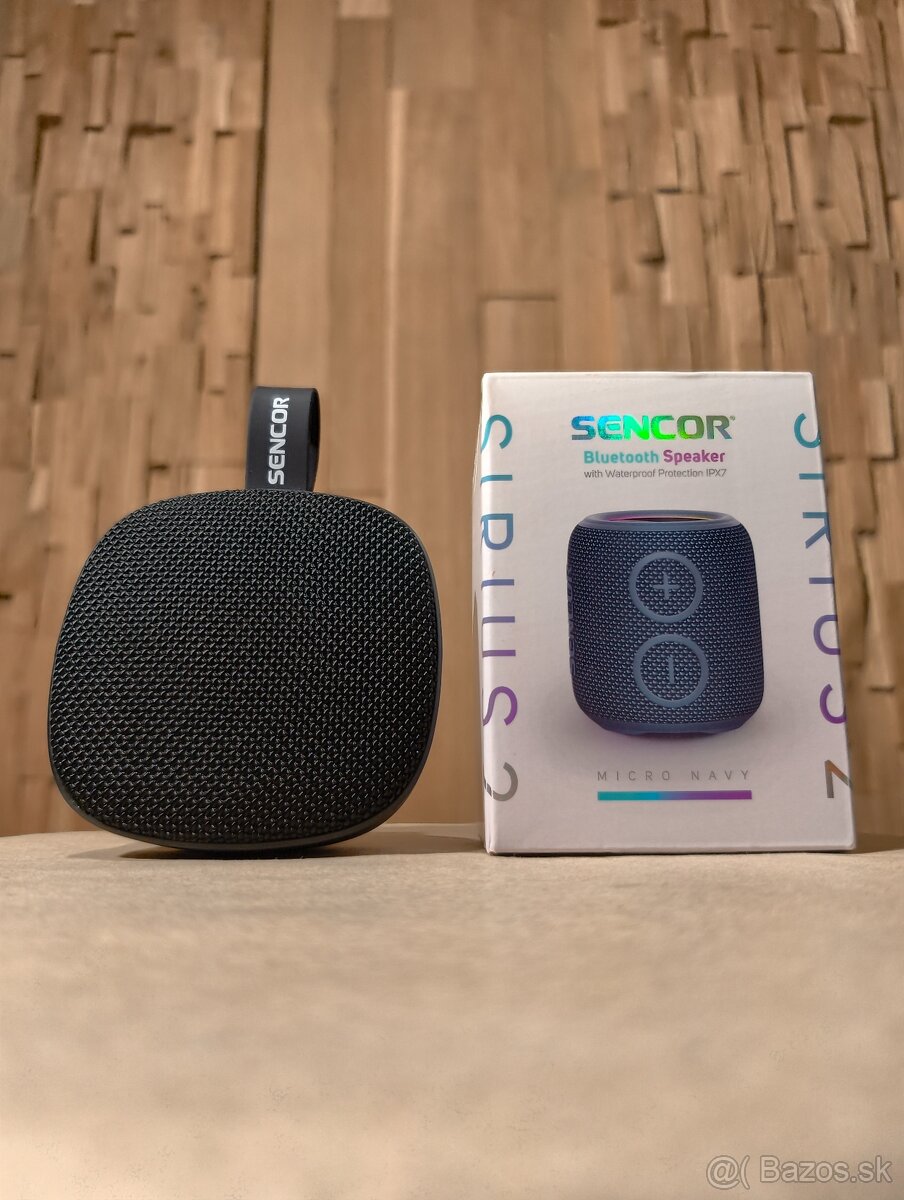 Sada dvoch nových nepoužívaných prenosných Bluetooth reproduktorov - Sencor SIRIUS 2 Micro (nerozbalený) vo farbe Navy a Sencor SSS 1060 NYX Mini (bez škatuľky) vo farbe Black.